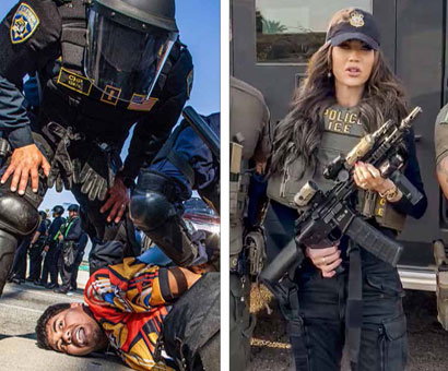 ◀ Policías llevaron a cabo operativos en la autopista 101 de Los Ángeles. A la derecha, la titular de Seguridad Interna, Kristi Noem, porta un uniforme de agente del Servicio de Inmigración y Aduanas (ICE). Fotos Afp y @Sec_Noem
