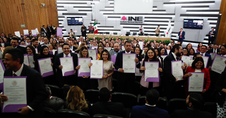 ▲ El INE concluyó ayer su responsabilidad en la organización del primer proceso electoral para el Poder Judicial al entregar los documentos que acreditan el triunfo del más numeroso bloque, integrado por 438 magistrados de tribunales de circuito y 363 jueces de distrito. Durante la ceremonia, la consejera presidenta, Guadalupe Taddei, reafirmó que su nombramiento es resultado de un proceso democrático y no por la designación de una élite. Foto Cristina Rodríguez. N. Jiménez y F. Martínez