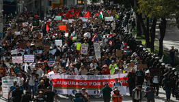 ◀ Más de 20 colectivos marcharon sobre Insurgentes, del Metrobús Fuentes Brotantes hacia El Caminero, con la consigna de que se cancele una megaobra inmobiliaria en la zona. Luego, encapuchados causaron destrozos en el MUAC y mobiliario urbano. La UNAM condenó los hechos e interpondrá denuncias. Foto Jorge Ángel Pablo García.