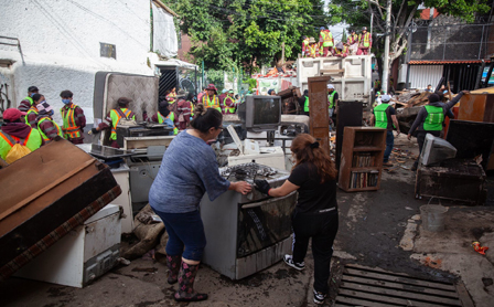 ▲ La lluvia del sábado no sólo inundó calles en la alcaldía Magdalena Contreras, sino también provocó un deslizamiento de tierra en zonas con terreno irregular. El gobierno capitalino informó que 80 viviendas resultaron afectadas, 29 de ellas con daños graves, aunque continúa haciendo el censo de damnificados y se activó la cobertura del seguro de desastres. Los vecinos y trabajadores realizaron limpieza; en la imagen, la calle Hortensia. Foto Cuartoscuro. Mara Ximena Pérez