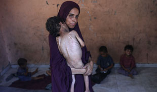 ▲ Una madre palestina carga a su hijo malnutrido de 2 años. Foto Afp