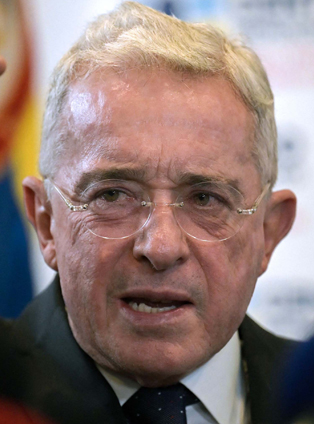 ▲ El ex presidente Álvaro Uribe fue acusado de los delitos de soborno a testigos y fraude procesal, para evitar ser señalado de tener vínculos con el paramilitarismo, en un fallo sin precedente en ese país. Se espera que en la próxima audiencia se dé a conocer la condena. Foto Afp. Agencias