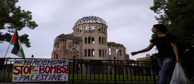 ▲ A punto de conmemorarse ocho décadas de que Estados Unidos arrojó la primera bomba atómica, en la ciudad de Hiroshima pobladores colocaron una manta en el Parque de la Paz, frente al único edificio que permaneció en pie luego del ataque a Japón el 6 de agosto de 1945, durante la Segunda Guerra Mundial. Foto Ap