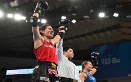 ◀ La mexicana derrotó 29-28 a la polaca Martyna Kierczynska en la final de la categoría de 54 kilogramos de muay thai en la justa de Chengdú, China. La arena estaba llena y la atmósfera fue increíble. Creo que dimos un buen espectáculo y eso me pone muy feliz. Se logró la meta, dijo la bicampeona mundial. Foto Xinhua