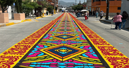 ▲ Habitantes de Santa Clara Coatitla, municipio de Ecatepec, estado de México, elaboraron decenas de tapetes multicolores con toneladas de aserrín pintado, con los cuales adornaron casi cuatro kilómetros para la procesión en honor a Santa Clara de Asís, que se realizó ayer entre música y la algarabía de los habitantes. Foto e información. Javier Salinas Cesáreo, Corresponsal