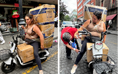 ◀ En diciembre comenzará el proceso para emplacar bicimotos y scooters eléctricos y expedir licencias de manejo en la Ciudad de México. La jefa de Gobierno, Clara Brugada, informó que su administración ya está en gestiones con las autoridades federales. En la imagen, una mujer en una bicimoto eléctrica se alista para transportar mercancías sujetas a su cuerpo con cinta adhesiva, en la calle de Mesones, en el Centro Histórico de la capital del país. Foto Luis Castillo.