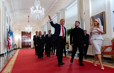 ▲ El presidente de Estados Unidos, Donald Trump, camina por el Corredor Transversal de la Casa Blanca, acompañado del presidente de Ucrania, Volodymir Zelensky, seguidos por el primer ministro de Gran Bretaña, Keir Starmer; el presidente francés, Emmanuel Macron; el canciller alemán, Friedrich Merz; la primera ministra de Italia, Giorgia Meloni; el presidente de Finlandia, Alexander Stubb; el secretario general de la OTAN, Mark Rutte, y la presidenta de la Comisión Europea, Ursula von der Leyen, durante un recorrido por la residencia oficial. Foto Ap