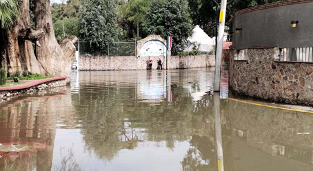 ▲ El centro histórico de este pueblo mágico ubicado en Querétaro se inundó ayer debido al desbordamiento de la presa El Centenario, que llegó a estar a 112.8 por ciento de su capacidad, lo que obligó a verter grandes cantidades de agua al río San Juan. En las entradas de los inmuebles, voluntarios y personal de protección civil colocaron sacos de arena. Foto e información de Ricardo Montoya