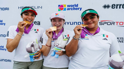 ◀ En el Campeonato Mundial de Gwangju, Corea del Sur, Maya Becerra, Mariana Bernal y Adriana Castillo dieron al país su primera corona del orbe al doblegar en la final de tiro con arco compuesto al equipo estadunidense. Con este histórico triunfo se consolidan en la élite y el camino rumbo a los Juegos Olímpicos de Los Ángeles 2028 se vislumbra prometedor. Foto Conade