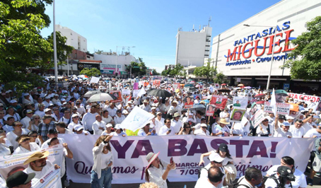 ▲ Cerca de que se cumpla un año de que estalló la guerra interna en el cártel de Sinaloa, miles de personas –la mayoría vestidas de blanco– marcharon ayer por las principales calles de Culiacán, en demanda de que se detenga la ola de violencia en la entidad, la cual no ha sido contenida pese al despliegue de unos 10 mil efectivos de seguridad federales y estatales. La movilización fue convocada por 36 agrupaciones. Foto Noé Mascareño / El Debate. Irene Sánchez, Corresponsal