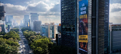 ▲ Activistas desplegaron una manta en el monumento, que mide 104 metros, para exigir al gobierno que proteja a la selva maya de la devastación. La Semarnat informó que sostuvo una reunión con representantes de la organización, en la que expuso las diversas acciones que se han realizado para la conservación de la zona. Foto Afp / Jared Laureles