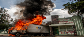 ▲ Tras la protesta de estudiantes de Ayotzinapa ante la instalación, embozados lanzaron un camión contra la entrada y lo incendiaron. Foto Jair Cabrera J. Laureles