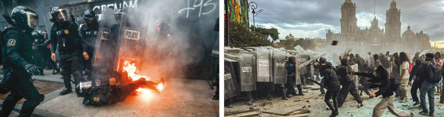 ▲ Armados con palos, martillos, bombas molotov y aerosoles, encapuchados arremetieron contra los efectivos policiacos. Fotos Víctor Camacho
