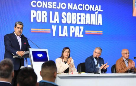 ▲ El presidente Nicolás Maduro participó ayer en la reunión plenaria del Consejo Nacional por la Soberanía y la Paz, donde emitió un mensaje al pueblo de Estados Unidos en el que manifestó: no queremos una guerra en el Caribe ni en Sudamérica. Además, pidió a empresarios, artistas e intelectuales de su país que se comuniquen con sus pares estadunidenses para romper el discurso que busca anatemizar a Venezuela y acusó a la CIA de ser la causante de golpes de Estado que en el pasado reciente dejaron miles de desaparecidos. Foto Xinhua