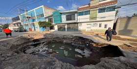◀ Una fuga de agua en la colonia Santa María Aztahuacán sigue causando problemas. En la calle Ignacio Allende las autoridades abrieron un boquete hace dos semanas para localizar el origen del problema, pero una falla geológica ha retrasado las labores. La zona está clasificada con grietas de nivel 4, el grado más alto de riesgo. Foto Víctor Camacho