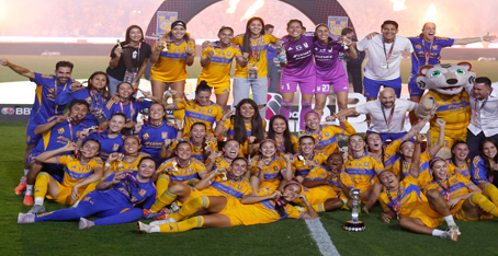 ▲ La escuadra felina ganó su séptimo título y se confirmó como la máxima ganadora, luego de vencer 1-0 (4-3 global) al América, lo que desató el festejo en el estadio Universitario, que se llenó para la final del Torneo Apertura 2025. El gol fue de Diana Ordóñez, quien aprovechó un error de la zaga visitante al minuto 19. Foto Afp. Erendira Palma Hernández, Enviada