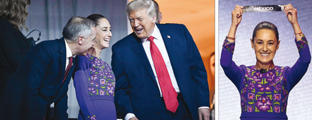 ▲ En el Centro Kennedy, por primera vez se encontraron los tres jefes de Estado de América del Norte, socios comerciales y ahora coorganizadores del máximo torneo mundial de futbol. Flanqueada por sus homólogos canadiense y estadunidense, la Presidenta destacó que México, sede de la justa por tercera vez, es un país