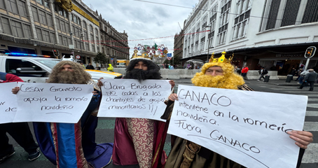 ▲ Santacloses, Reyes Magos, ferieros y comerciantes bloquearon calles del Centro Histórico en protesta porque no les permitieron instalar sus puestos en la romería del Monumento a la Revolución. El gobierno capitalino informó que dialogará con los organizadores para determinar un lugar donde puedan trabajar. Foto Alfredo Domínguez Elba M. Bravo y Rocío González