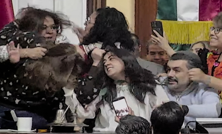 ▲ Con la ambición de obtener cuotas políticas en el nuevo organismo de transparencia de la Ciudad de México, el PAN trató de boicotear la sesión y frenar la aprobación del Paquete Económico para 2026, lo que derivó en una trifulca en la que hubo codazos, empujones y jaloneo de cabellos entre diputados del Congreso capitalino. Finalmente, el anterior instituto fue extinguido por la mayoría de Morena y sus aliados del PT y PVEM. Foto tomada de un video. Sandra Hernández