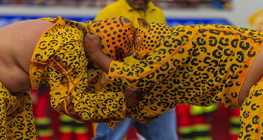 ◀ Miles de personas presenciaron dicha festividad en Chilpancingo, pese a las amenazas de grupos delincuenciales. Como parte de las celebraciones de la Feria de San Mateo, Navidad y Año Nuevo, hombres vestidos de jaguares se enfrentan a empujones y forcejeos, representando un duelo ancestral para pedir lluvia. Foto tomada del Facebook Yaoyeliztli.