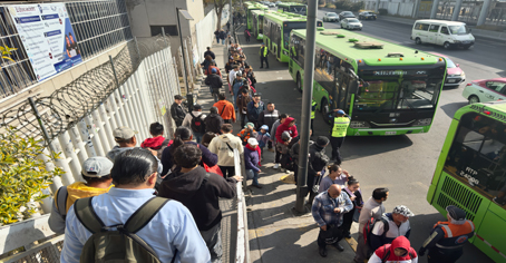 ▲ Incluso en domingo, en la estación Villa de Aragón hubo largas filas de usuarios para abordar las unidades de apoyo de RTP y trasladarse a la de Morelos, ante la suspensión del servicio en seis estaciones de la línea B por los trabajos de mantenimiento en el tramo elevado. Este lunes se reanudarán las operaciones de manera normal. Foto Roberto García Ortiz. Nayelli Ramírez