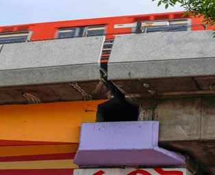 ▲ Trabajadores denunciaron los múltiples desperfectos que se pueden apreciar en el tramo elevado que corresponde a distintas estaciones de la vía que corre de Martín Carrera a Santa Anita (en la imagen, Talismán), como separación de ballenas y hundimientos. Foto Germán Canseco. Nayelli Ramírez