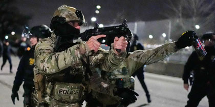 ▲ Efectivos de Aduanas y Protección Fronteriza se enfrentaron ayer de nueva cuenta con manifestantes frente al edificio federal en Mineápolis que sirve como base para los agentes de inmigración. Foto Ap