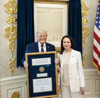 ▲ Machado entró ayer a la Casa Blanca por una puerta lateral y sin protocolo de recepción para reunirse con Donald Trump, quien agradeció a la venezolana que le obsequiara la medalla del Nobel de la Paz