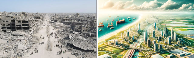 Junta de Pazen el Foro Económico Mundial de Davos, el mandatario de Estados Unidos presumió que él es experto en bienes inmobiliarios, mientras su yerno, Jared Kushner, expuso en diapositivas el proyecto de cuatro fases para renombrar ciudades y fragmentar el enclave en zonas de explotación turística e industrial, con departamentos de lujo, centros de datos, más de 100 mil viviendas y 75 instalaciones médicas. Fotos Afp y tomada de redes