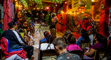 ▲ Por la noche, el callejón de Hamel, en Centro Habana, se transforma en el escenario donde tiene lugar un show muy peculiar, no comercial, LGBT+, afro y con murales que refieren a la santería, con símbolos yorubas por todos lados como coreografía. Las protagonistas son dos chicas trans afrocubanas que interpretan éxitos de Ana Gabriel, Juan Gabriel y más canciones mexicanas. Lo hacen para su comunidad, a la que casi no asisten extranjeros. Niños y niñas, señoras y ancianos disfrutan la presentación. Gozan pese a todo. Foto Jair Cabrera Torres