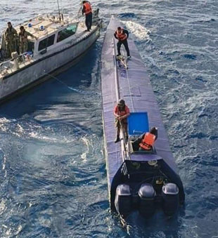 ▲ Elementos de la Marina interceptaron ayer en las costas de Manzanillo un semisumergible que transportaba 179 bultos con cuatro toneladas de cocaína y detuvieron a tres personas. Foto Gabinete de seguridad / César Arellano