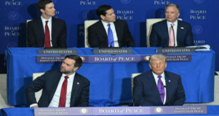 ▲ El republicano estuvo acompañado (de izquierda a derecha y de arriba a abajo) por su yerno Jared Kushner; el secretario de Estado, Marco Rubio; el enviado especial para la franja, Steve Witkoff, y el vicepresidente JD Vance. Foto Afp
