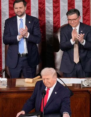 ▲ En su informe sobre el estado de la Unión, el más largo en la historia de Estados Unidos y a contracorriente de lo que piensa la mayor parte de la población, el magnate se ufanó de haber logrado lo imposible y de que su país se encuentra en su edad de oro con una economía en auge, una frontera más fuerte y segura y hasta se dio el crédito por la eliminación de El Mencho. En respuesta al discurso, el senador demócrata Alex Padilla llamó a alzar la voz ante las mentiras del mandatario. Foto Ap / David Brooks y Jim Cason, corresponsales