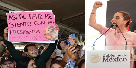 ▲ En su segundo día de gira por la entidad, la mandataria estuvo ayer en la capital, Culiacán, donde resaltó que los sinaloenses son hombres y mujeres de trabajo, por lo que les manifestó su apoyo luego de ya casi 18 meses de zozobra a causa del enfrentamiento entre las facciones criminales de Chapitos y Mayiza. Entre los asistentes al acto, un joven mostró una cartulina con la imagen del monito japonés Punch, que se ha vuelto viral por su apego a un peluche parecido a él. Fotos Presidencia. Emir Olivares, Enviado