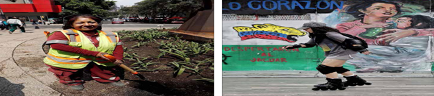 ▲ El Gobierno de la Ciudad de México anunció un sistema público de cuidados dentro de la Secretaría de Seguridad Ciudadana, apoyos económicos y el Premio a la Mujer Policía del Año. A la izquierda, María Angélica trabaja en la limpieza de las calles capitalinas; a la derecha, una joven muestra su habilidad sobre patines. Fotos Marco Peláez y Jair Cabrera