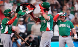 ◀ México comenzó el Clásico Mundial con victoria de 8-2 sobre Gran Bretaña. En la imagen, Jonathan Aranda (centro) festeja su jonrón de la octava entrada. Japón, Cuba y Venezuela también ganaron sus respectivos duelos. Foto Ap