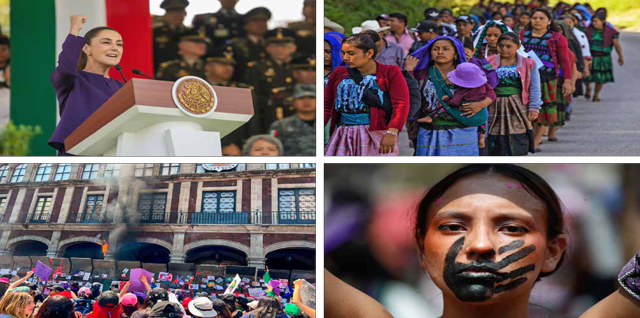 ▲ Durante una ceremonia en el Campo Marte, la presidenta Claudia Sheinbaum reivindicó el papel de las mujeres en las fuerzas armadas, mientras unas 400 integrantes de la organización Sociedad Civil Las Abejas marcharon en Chiapas (imagen de arriba a la derecha). También hubo manifestaciones en otros estados, con disturbios y detenidos en nueve de ellos. En Cuernavaca (abajo) lanzaron bombas molotov al palacio de gobierno, donde exigieron justicia por el reciente asesinato de dos universitarias. Al lado, una joven que participó en la movilización realizada en la Ciudad de México. Fotos Presidencia, Afp, Rubicela Morelos y Cristina Rodríguez