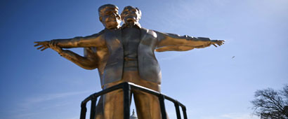 ▲ Una estatua que muestra al presidente Trump y al fallecido delincuente sexual Jeffrey Epstein fue instalada ayer en el National Mall, cerca del Capitolio de Estados Unidos. La escultura, titulada King of the World, hace referencia al icónico momento de la película Titanic (1997), cuando los protagonistas se colocan juntos en la proa del barco. Foto Afp The Independent y Ap