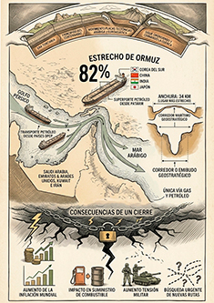 El estrecho de Ormuz es un corredor marítimo geoestratégico y tenso de gran importancia que conecta el golfo Pérsico con el mar Arábigo, su anchura es de 34 kilómetros es su lugar más estrecho, es como una garganta o embudo geográfico; es la única vía para transportar el gas y el petróleo desde el golfo Pérsico.