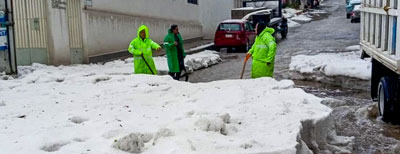 ▲ Una torrencial lluvia acompañada de granizo, que duró unos 30 minutos, provocó afectaciones en calles de varias colonias de la zona alta de la Sierra de Guadalupe, así como la caída de los arcotechos en una primaria, la Vocacional 3 y una bodega; el hielo alcanzó un metro de altura en algunos sectores de Lomas de San Carlos. Foto La Jornada / Javier Salinas, corresponsal