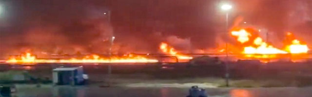 ▲ Al menos cinco personas fallecieron, entre ellas una trabajadora de Pemex, por la conflagración alrededor de la barda perimetral del predio 1 de almacenamiento de hidrocarburos en la refinería Olmeca. La empresa explicó que probablemente el incendio se produjo por aguas aceitosas acumuladas. Foto tomada de redes / A. Alegría