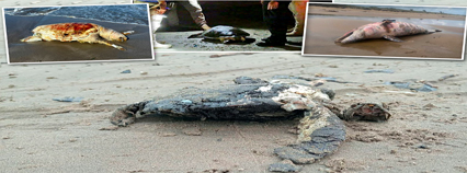 ▲ Tras el derrame de hidrocarburo que afecta gran parte de las costas del estado han aparecido sin vida al menos cinco quelonios y dos delfines. En tanto, las autoridades atribuyen el desastre a un barco de una empresa privada y niegan responsabilidad de Pemex. Fotos La Jornada I. Sánchez y A. Villaseñor