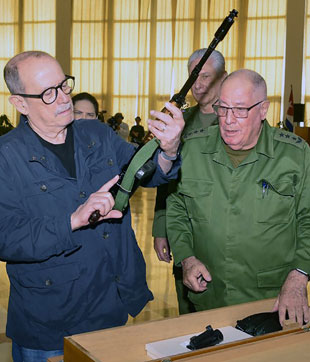 ▲ El titular de las Fuerzas Armadas Revolucionarias, el general Álvaro López Miera, y el presidente Miguel Díaz-Canel entregaron un fusil AKM de combate al cantautor. Foto ministerio de las Fuerzas Armadas Revolucionarias