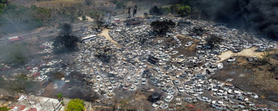 ▲ Un siniestro en un corralón ubicado a la altura del poblado de San Antonio, en la carretera federal Acapulco-Pinotepa, en la zona rural de Acapulco, Guerrero, se prolongó más de siete horas. El fuego afectó cuatro hectáreas de pastizales y maleza seca y calcinó 700 vehículos chatarra. Las autoridades investigan qué originó la conflagración, que consumió 80 por ciento de dicho inmueble y fue controlada pasadas las 17 horas. Foto Afp / Héctor Briseño, corresponsal