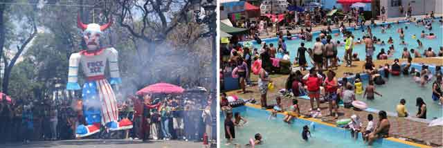 ▲ En Santa María la Ribera los judas ardieron en repudio a la guerra iniciada por Estados Unidos en Medio Oriente y la discriminación en ese país. El protagonista del Colectivo de Cartoneros de la Ciudad de México fue un monigote contra el ICE y la política antimigratoria. En tanto, como ya es costumbre en Sábado de Gloria, los capitalinos acudieron a las fuentes de la Alameda Central a refrescarse y también a balnearios, como el Olímpico de Pantitlán, en Iztacalco (en la imagen), y el Elba, en Iztapalapa. Fotos Cuartoscuro y Jair Cabrera / Josefina Quintero y Kevin Ruiz