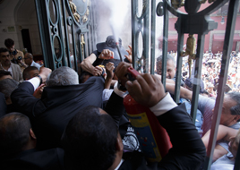 ◀ Integrantes de la Asamblea de Barrios irrumpieron en el recinto legislativo a empujones, botellazos y hasta mordidas luego de que un guardia de seguridad intentara usar un extintor para ahuyentarlos. Los manifestantes, principalmente mujeres, exigían vivienda y reformas para la recuperación de créditos. Foto Cuartoscuro