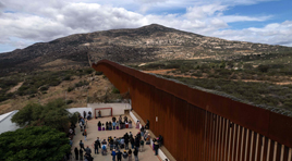 ◀ Ante la ampliación del muro fronterizo que emprende Estados Unidos, miembros de pueblos originarios protestaron por la destrucción de vestigios de la etnia kumiai tras las explosiones con dinamita en el cerro El Cuchumá, una de las cinco Montañas Sagradas del Mundo en la cosmogonía indígena de Baja California. Foto Afp